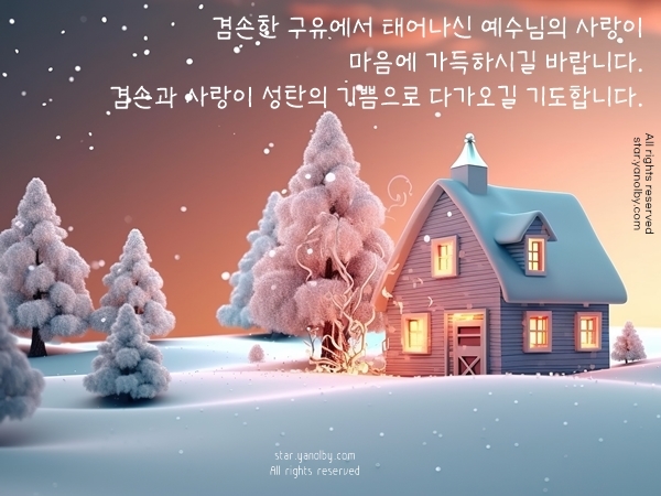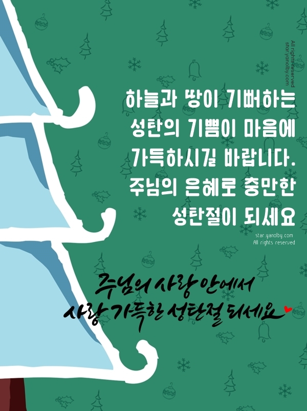 새하얀 눈이 내린다면 더 설레는 크리스마스가 되겠지만 이번 크리스마스는 눈이 내리지 않더라도 마음 속 기쁨이 쌓이는 날이 되길 바랍니다. 가족과 함께 예수님의 탄생을 축하하며, 사랑의 빛이 가득한 성탄절 보내시길 바랍니다. 주님의 은혜로 따뜻하고 아늑한 크리스마스 되세요.