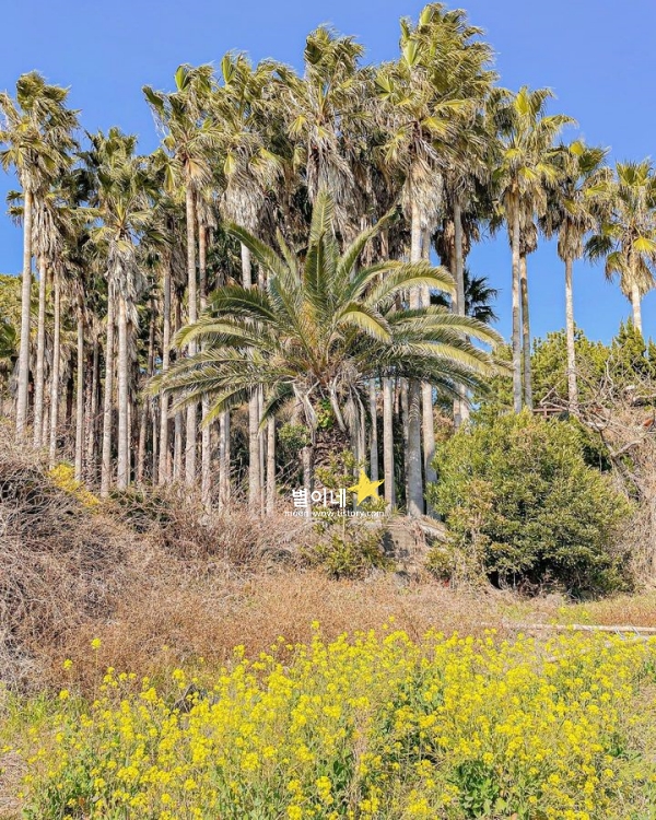 속골유원지의 특징 중 하나는 이국적인 분위기를 자아내는 야자수 가로수입니다. 유채꽃과 야자수가 어우러진 풍경은 마치 해외의 휴양지에 온 듯한 느낌을 줍니다. 또한, 범섬과 바다, 그리고 갯무꽃이 함께 어우러져 다른 꽃 명소들보다도 더 만족스러울 것입니다.