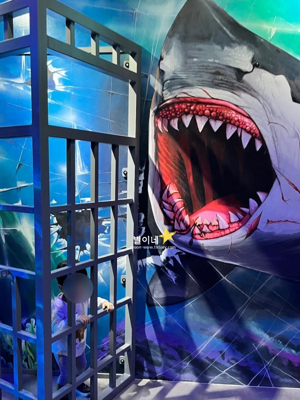이어 서핑보드로 바다수영대회를 체험하거나, 바다생물을 카드보드로 관찰하는 시간이 신선했습니다. 상어 케이지 다이빙 체험은 움직이는 케이지 속에서 상어가 들이받는 4D 효과로 긴장감을 주었습니다.