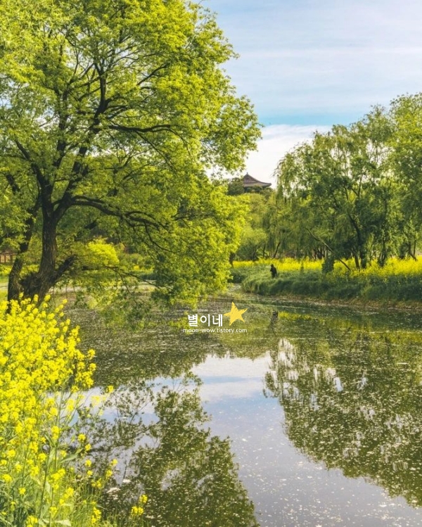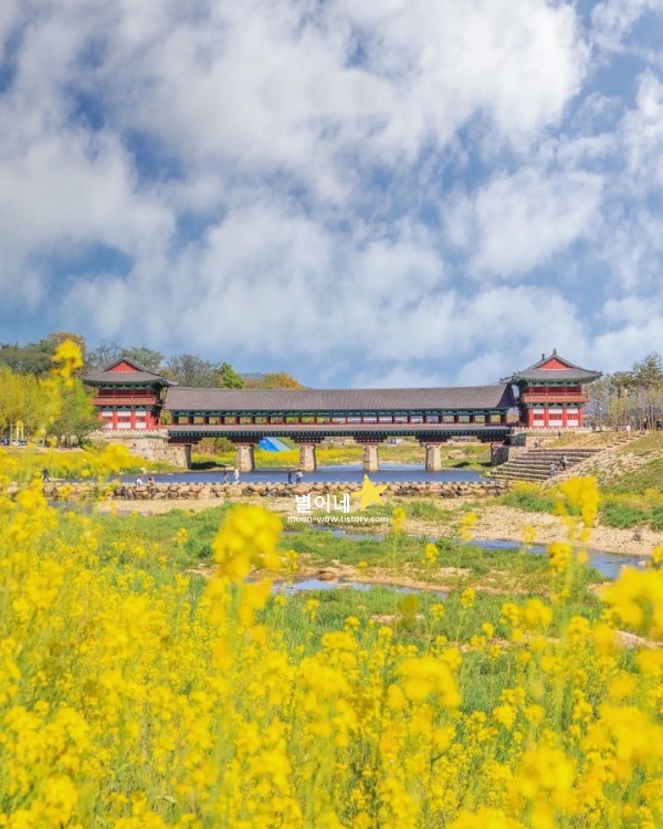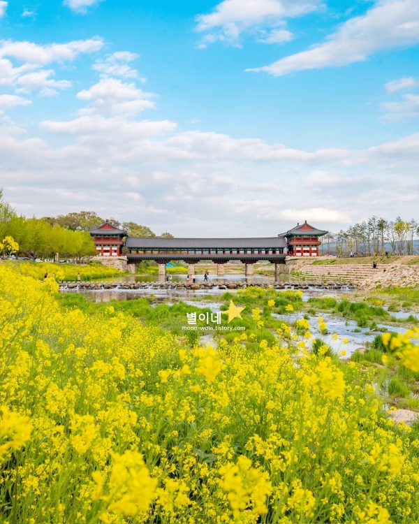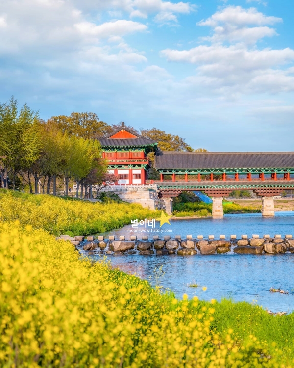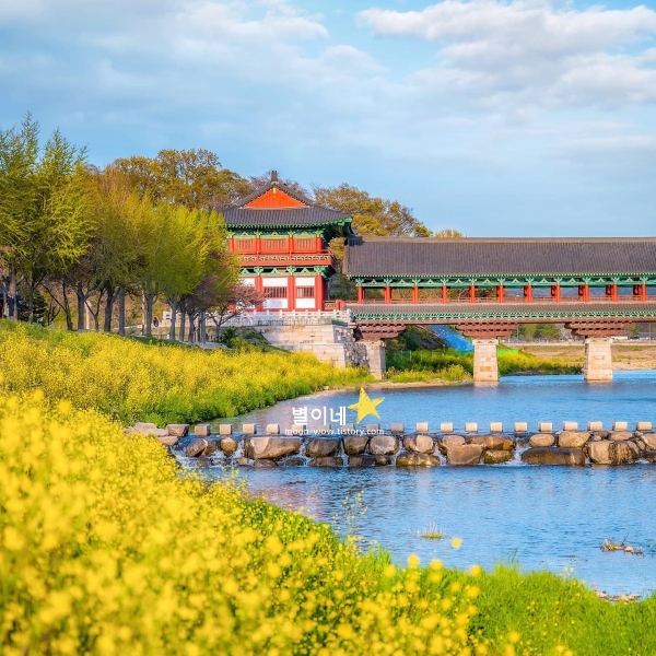 월정교를 지나며 노란 유채꽃이 가득한 풍경을 마주하면, 봄이 한층 더 가까이 다가온 기분이 듭니다. 돌다리를 건너면서 바라보는 유채꽃밭은, 강을 따라 넓게 퍼져 있어 더욱 시원한 느낌을 주죠. 전통 목조 건축인 월정교와 대비되는 유채꽃의 밝은 색감이 함께 어우러지면서, 봄날의 경주를 더욱 특별하게 만들어주는 경주 봄에 가볼만한곳 베스트 10입니다. 유채꽃이 있던 자리는 여름이면 해바라기밭이 펼쳐집니다.