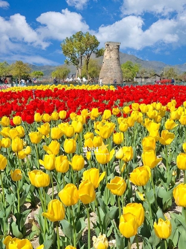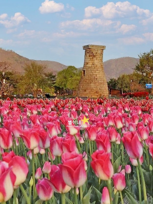 첨성대 유채꽃과 튤립