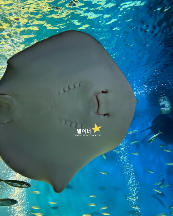 1층에서는 알록달록한 물고기들과 느릿하게 헤엄치는 거북이들이 먼저 반겨준다. 먹이 주기 체험도 가능해, 아이들과 함께라면 더욱 즐겁게 관람할 수 있는 공간이다. 2층으로 올라가면 해저터널이 펼쳐지는데, 상어와 가오리가 바로 머리 위를 지나가는 순간이 꽤 인상적이었다. 유리벽 하나를 사이에 두고 마주하는 커다란 상어는 생각보다 더 웅장하고 강렬한 느낌을 줬다.