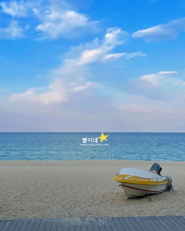 모래사장은 한 걸음 내디딜 때마다 사르륵 흩어질 만큼 부드럽다. 신발을 벗고 걸어보면 발바닥이 폭신하게 감싸이는 기분이 든다. 해변을 따라 걷다 보면 포토존도 있지만, 굳이 특정한 곳을 찾지 않아도 된다. 어디서든 바다를 배경으로 사진을 남기면 충분하니까.