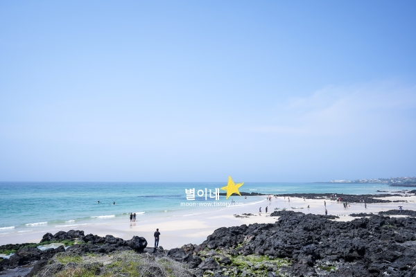 곽지 바다는 맑다는 말도, 에메랄드라는 말도 덜 어울려요. 햇살이 센 날엔 물빛이 투명한 유리창 같고, 흐린 날엔 물 아래 초록이 더 짙어져요. 파도가 밀려올 땐 색이 바뀌고, 썰물 땐 모래결이 그대로 드러나요. 눈으로만 봐도 시원한데, 가까이 가서 보면 꼭 풍경에 손이 닿을 것 같아요.