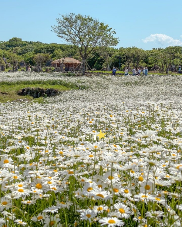 돌문화공원은 이름처럼 조용한 돌의 공간이에요. 그런데 5월이면 그 풍경이 달라지는 5월 제주도 가볼만한곳 10곳입니다. 돌담과 산책로 옆으로 하얀 샤스타데이지가 한 무리씩 피어 있어요. 처음엔 그냥 지나치지만, 조금 걷다 보면 어느새 꽃들 사이를 걷고 있다는 걸 느끼게 됩니다.