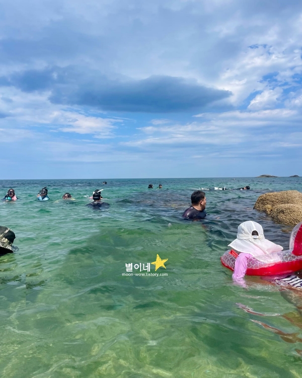 스노클링 장비 대여는 일부 펜션이나 카페에서 대여가 가능하고 바위 구간에서 낚시하는 사람들이 많았습니다. 조용한 해변과 함께 바위 포인트, 청정한 바닷물, 캠핑과 바비큐 가능한 펜션까지 있어 물놀이와 휴식, 작은 모험이 모두 가능한 숨은 바다 보물섬 같은 8월 강원도 여행 갈만한곳입니다.