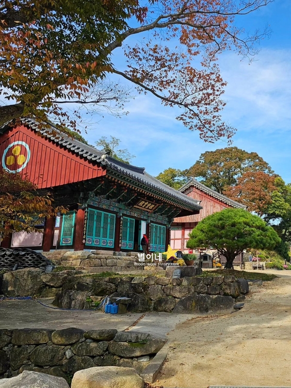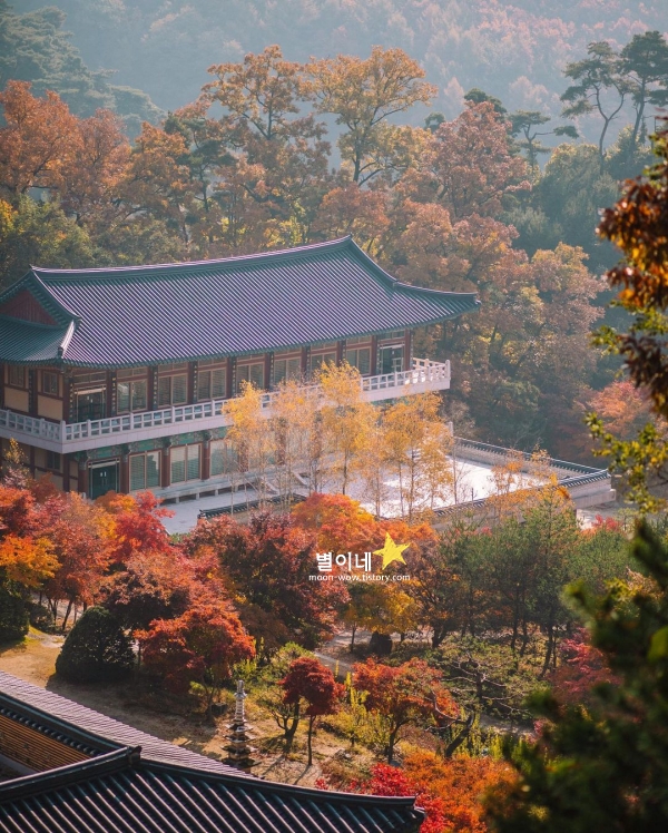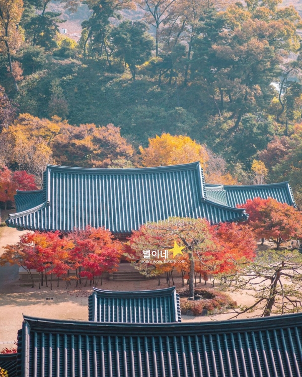 하늘이 열린 날, 단풍과 전각이 함께 담긴 사진이 인생샷이었고 생각보다 숲이 깊고 색감이 화려해 놀랐습니다. 사진 찍기 좋은 포인트로는 사찰 입구 숲길, 대웅전으로 향하는 계단길, 천척루 누각 주변입니다.