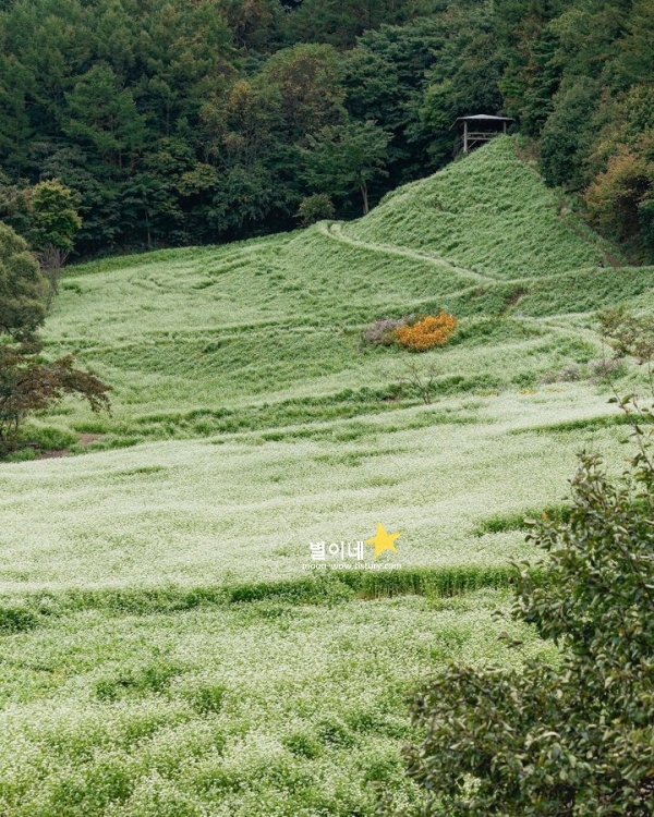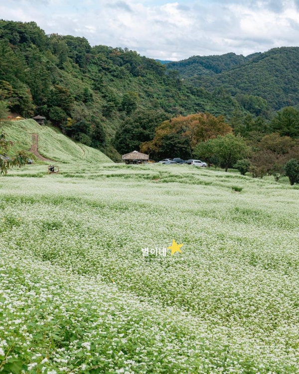 언덕 따라 이어지는 하얀 꽃길이 마치 구름 위를 걷는 것 같았고 햇살 좋을 때 꽃잎 흔들리는 순간을 사진에 담으면 정말 영화 같습니다. 포토존과 오두막 전망 포인트가 잘 조성되어 있어 사진 찍기 좋고, 전체를 천천히 둘러보면 1시간 이상 소요됩니다. 메밀꽃 사이를 걸으며 바람에 흩날리는 꽃잎을 마주하는 순간, 자연이 주는 위로가 참 깊게 스며든답니다.