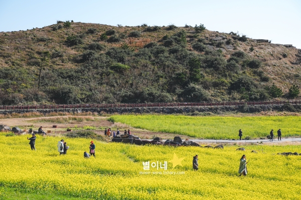 산방산 아래쪽은 계절별로 꽃밭이 조성되는 곳으로 알려져 있으며, 겨울과 이른 봄에는 유채꽃이 여행자들을 불러 모읍니다. 해마다 개화 시기는 조금씩 차이가 있지만, 대체로 1월부터 꽃이 피기 시작해 2월 사이에 노란 물결이 절정을 이루는 편입니다. 산방산을 배경으로 펼쳐지는 유채밭은 산과 들, 바다가 한 장면에 담기는 풍경이라 사진 한 장만 남겨도 여행 기분이 또렷하게 살아납니다.
