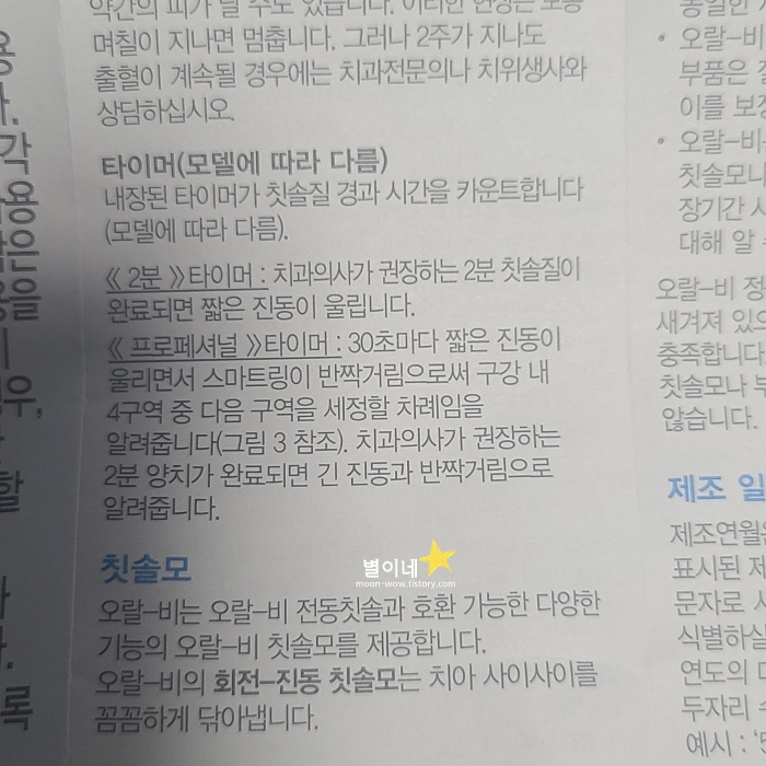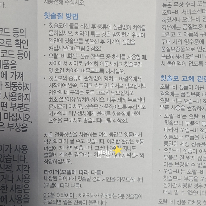하도 오래 전에 구매해서 생각나지도 않았던 오랄비 전동칫솔 사용방법도 다시 한 번 읽어보게 됩니다.
