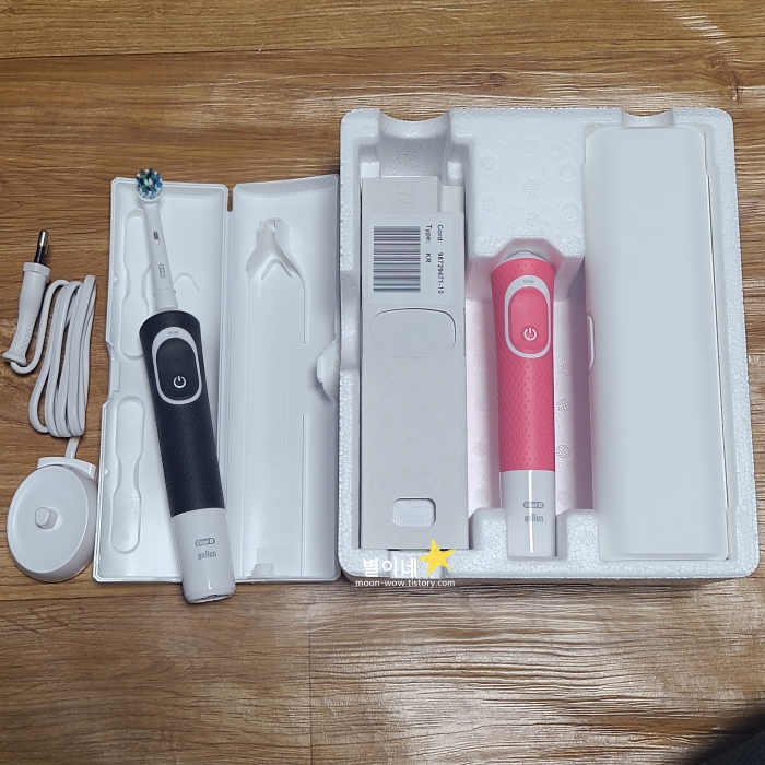 케이스는 딱 맞게 홈도 완벽하게 있었습니다. 오랄비 전동칫솔 PRO100 트윈팩 2세트에는 색상이 블랙, 핑크, 화이트가 있었고, 각 색상에 따라 칫솔모가 다른 종류가 내장되어 있었습니다. 칫솔모야 어차피 3 ~ 4개월이면 바꿔야하니까 오래 사용해야하는 본체 색상이 이쁜 걸로 선택하게 되었구요.