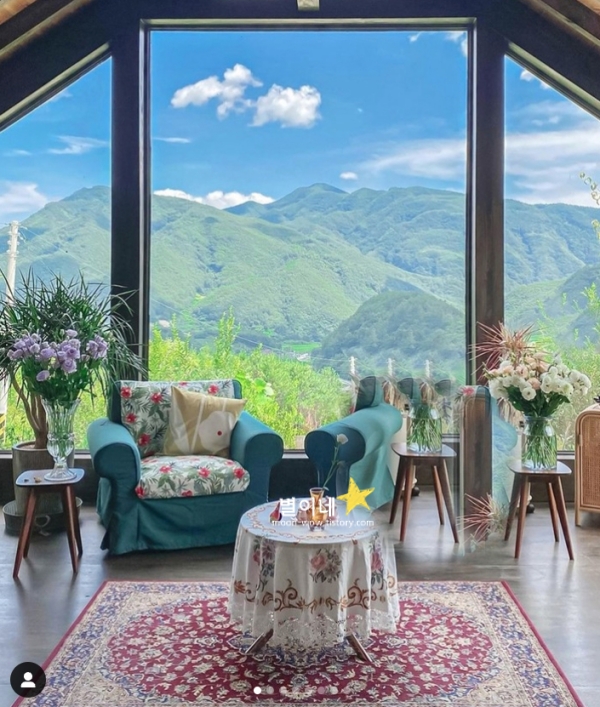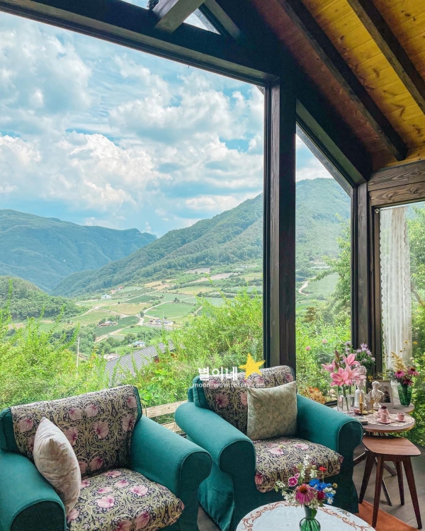 경북의 알프스, 예약제로 운영되는 환상적인 뷰 카페 홀리가든입니다. 커다란 통창 너머로 4계절을 모두 느낄 수 있어 봄 여름 가을 겨울 할 것 없이 인기있는 곳입니다. 그림이 아닌가 의심이 될 정도로 커다란 통창 너머 풍경이 아름다웠습니다. 넋을 놓게 되는 자연 속에서 커피 한 잔한다면 이만한 행복이 어디있을까요. 예약제 카페로 시간당 4팀만 받고 있어서 사람 많은 거 싫어하는 분들도 여유롭게 즐길 수 있는 경북 봉화 가볼만한곳 베스트 10곳입니다.