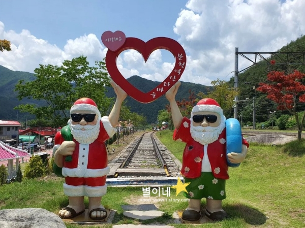 분천역은 산타마을인데 역을 산타마을로 꾸며놓은 겁니다. 아기자기하게 꾸며져 있어서 겨울에 오면 좋을 듯한데 한여름에 만난 산타마을도 이색적이고 반갑기도 하고 오히려 또 좋기도 했습니다. 백두대간 수목원 가는 김에 들린 분천역 산타마을은 아기자기한 산타모형들과 알파카를 만날 수 있는 장소입니다.