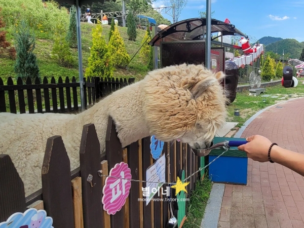 분천역 산타마을에는 알파카 먹이주기 체험도 가능한데 자판기에 1,000을 넣으면 종이컵에 먹이가 나옵니다. 어디 목장에 비싼 입장료 주고 들어가지 않아도 알파카를 볼 수 있어서 좋았고 알파카 너무 귀엽네요.