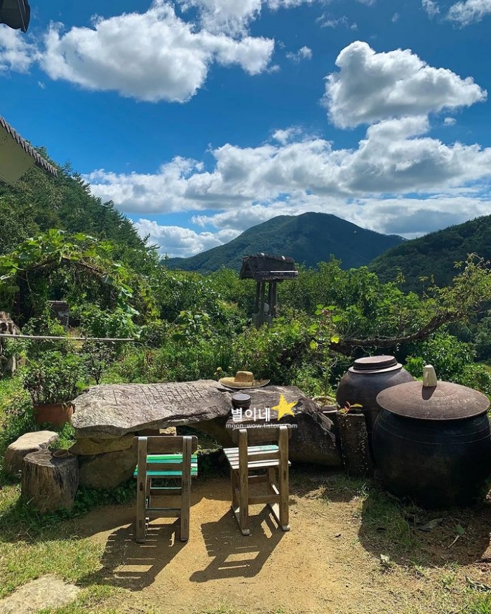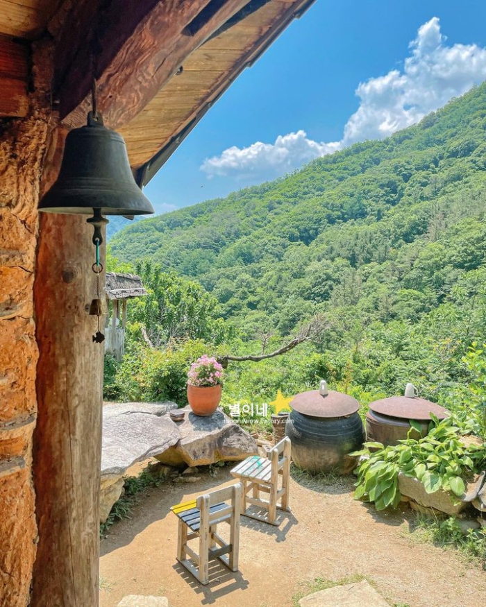 굽이굽이 산길을 올라가다보면 오두막이 나와요. 산 속 깊이 숨어있지만 발견하는 순간 파란 하늘과 사방을 둘러싼 산이 너무 예뻐서 바로 사랑에 빠질 수 밖에 없었던 5월 국내여행지 베스트 10입니다. 홍시스무디랑 가래떡은 무조건 시키기를 추천합니다. 달달하니 완전 꿀맛이었습니다.