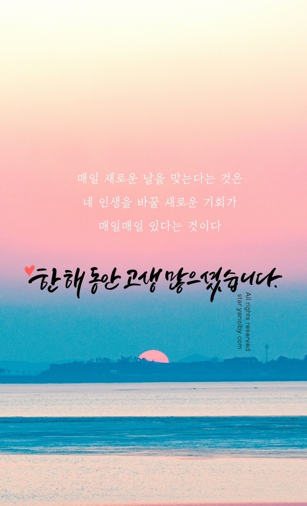 지금 삶에 재미를 느끼지 못하는 것은 내가 지금 내 삶에 집중하지 않았기 때문입니다. 나에게 다가오는 행운을 잡기 위해서는 나는 나 자신이 되어야 합니다. 세상에서 가장 소중한 것 나 자신입니다. 새해에는 기대 이상의 좋은 일들만 가득하길, 또다른 시작을 응원하며 새해 복 많이 받으십시오.