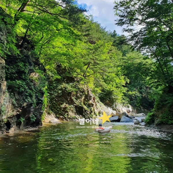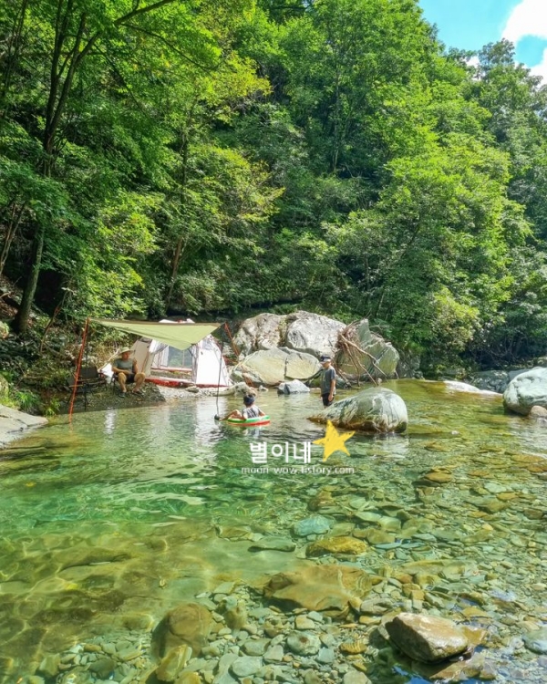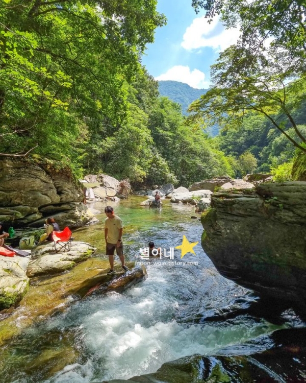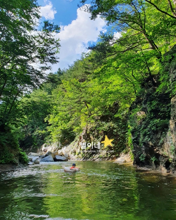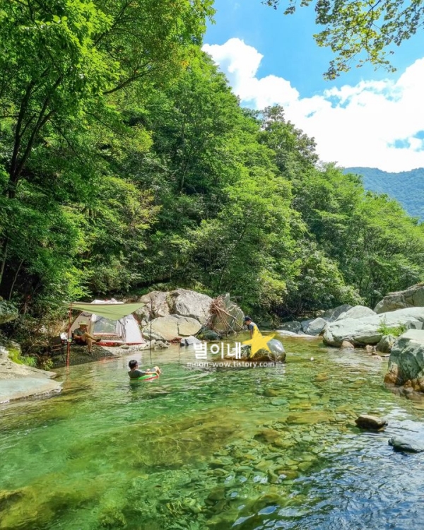 누가 계곡에 물감을 풀었나 싶을 정도로 색감이 정말 예쁘고, 청량함 한가득인 계곡 수영장입니다. 물고기가 보이는 투명함이 최고였으며 여기는 완전 신선놀음 끝판왕인 국내 힐링 여행지 베스트 10 입니다.